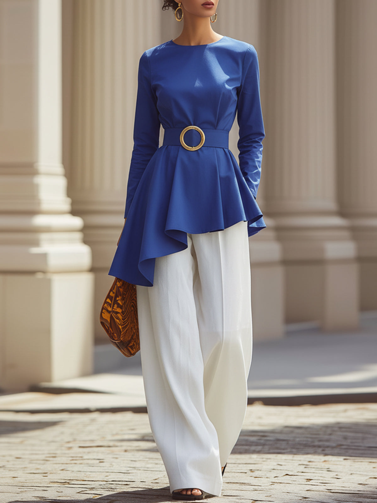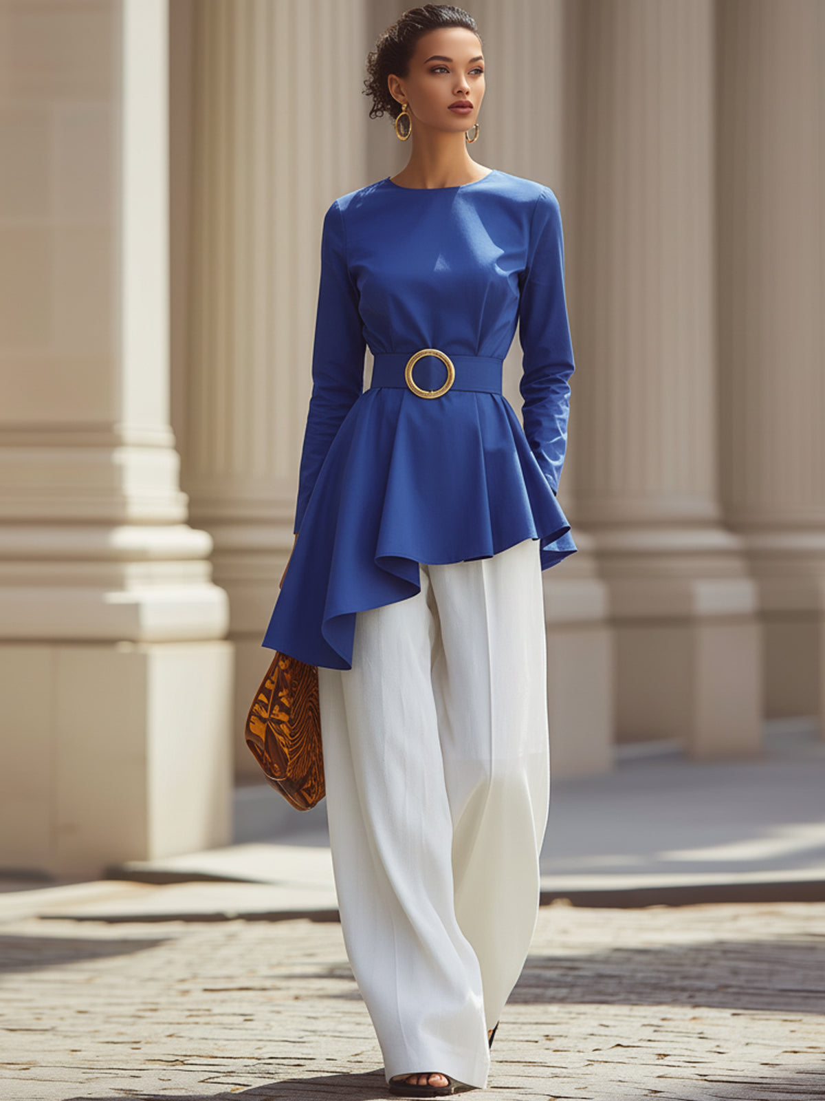 Blue And White Striped Asymmetrical Top With White Wide-leg Pants
