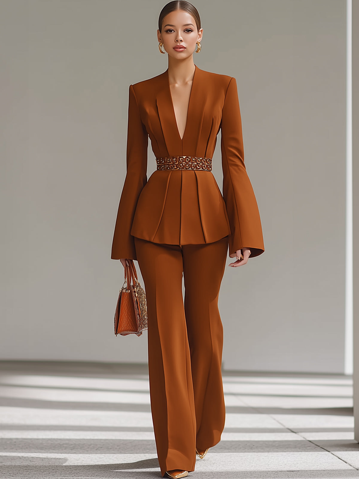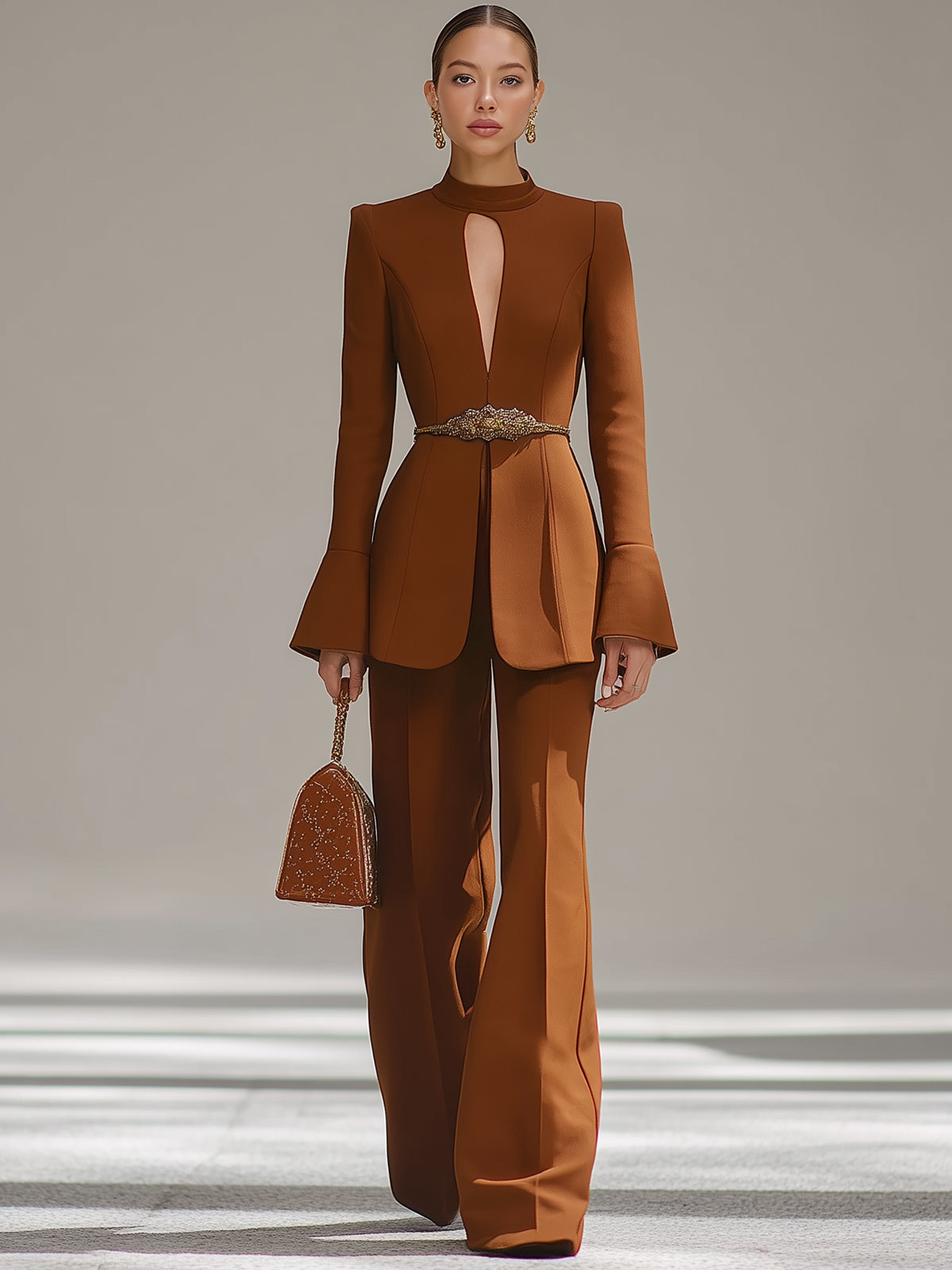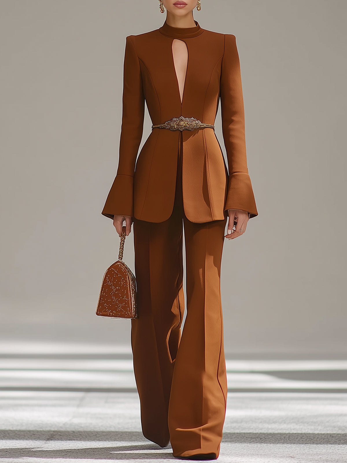 Caramel Hollow Waist Belt Suit