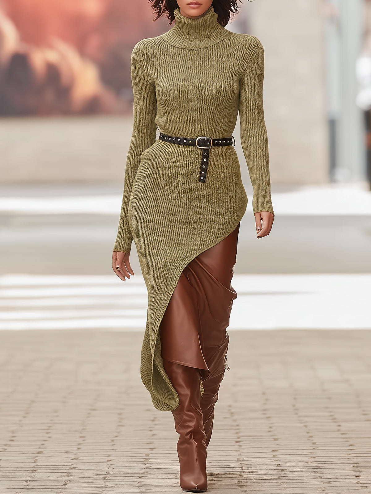Olive Green High-neck Irregular Knitted Dress