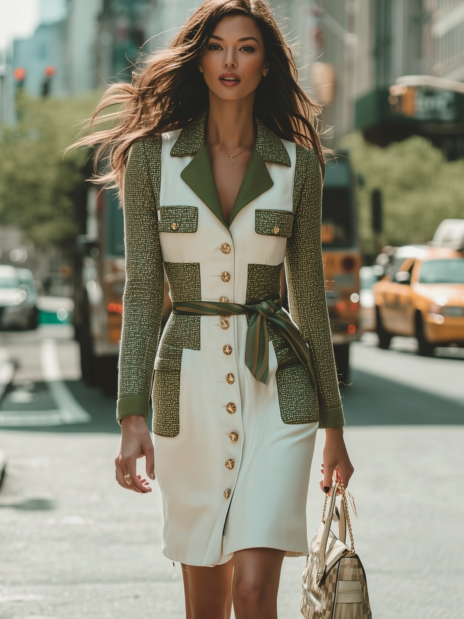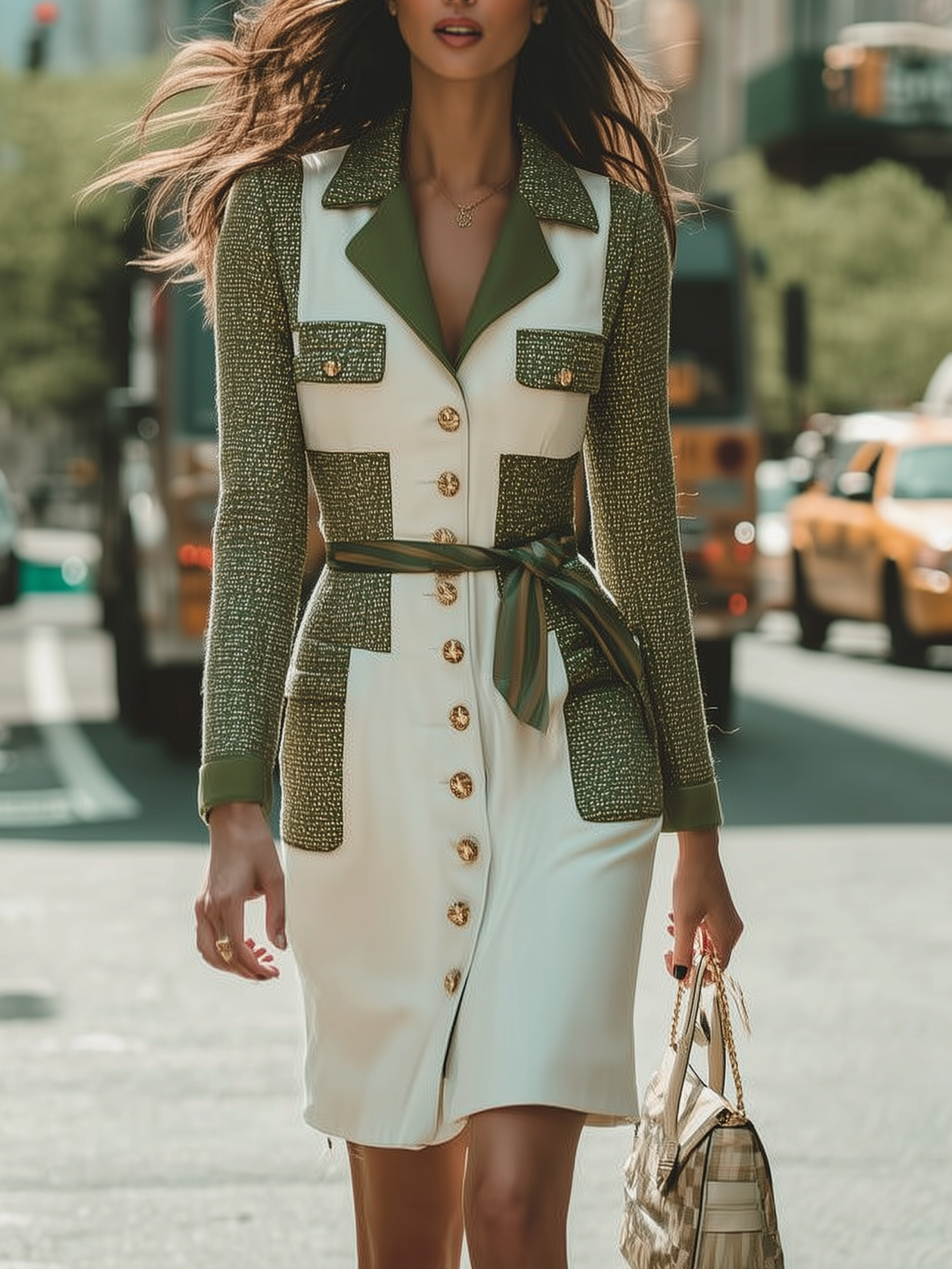 Contrast Panel Blazer Dress With Gold Buttons And Sash