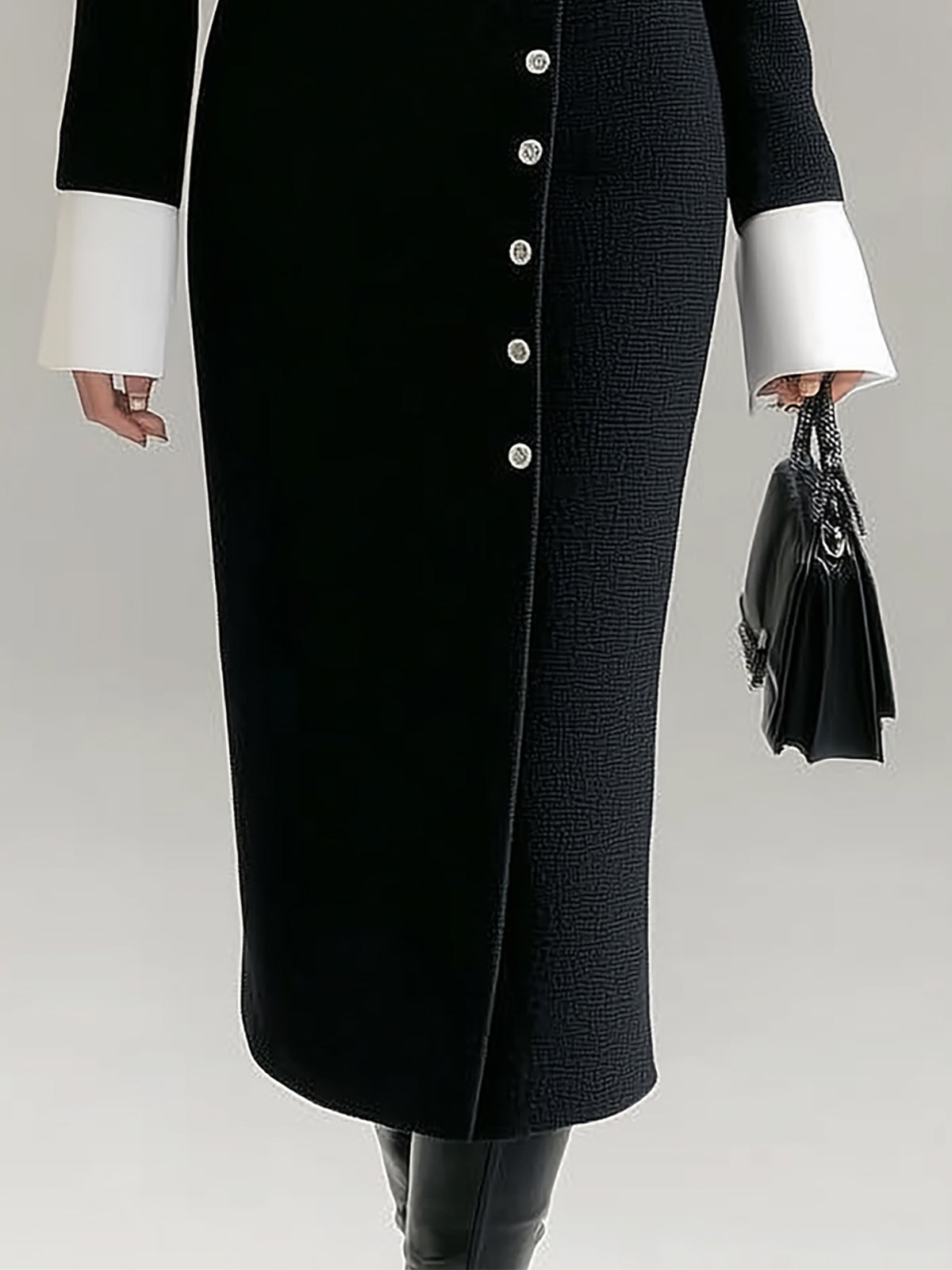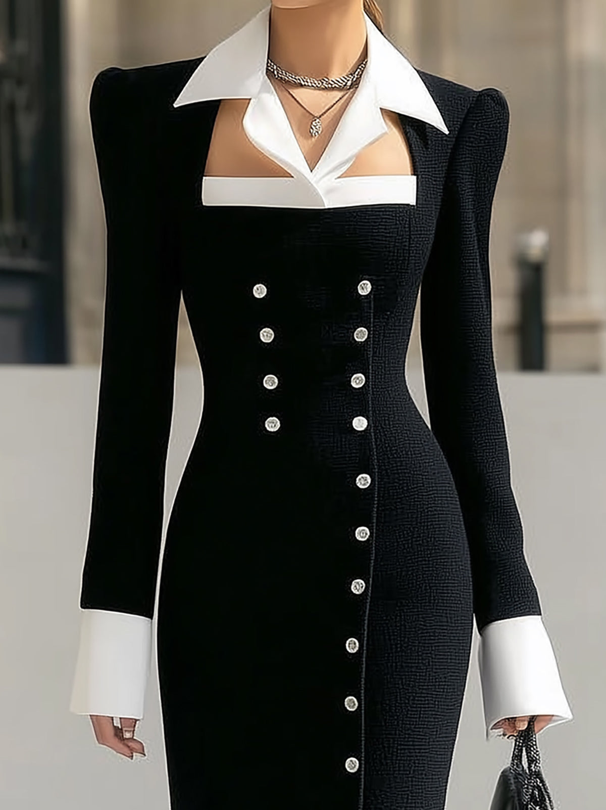 - Design: Features a square neckline with a crisp white shirt collar, long sleeves with subtle puffed details at the shoulders, black button detailing down the front, and fitted silhouette to accentuate the waist; minimalistic yet stylish