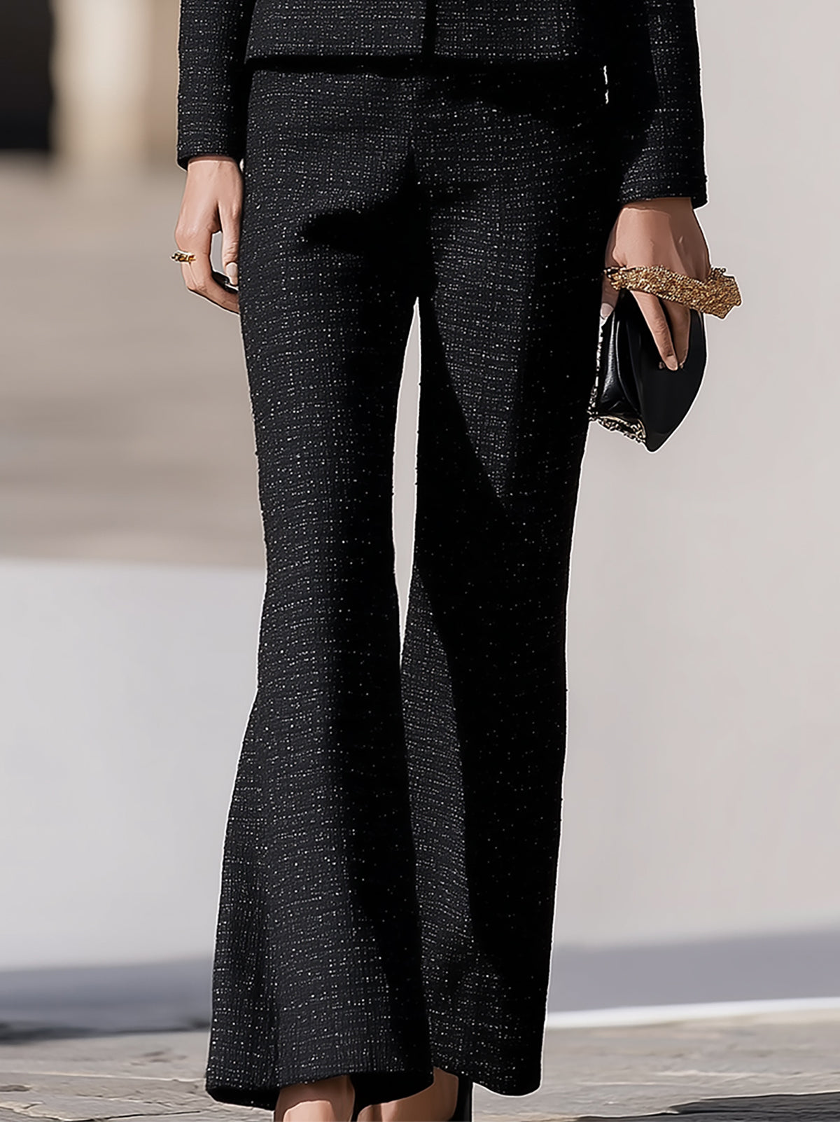Pair this set with black pointed-toe heels and a coordinating structured handbag for a polished, chic look. Add subtle gold jewelry, such as earrings and a bracelet, to elevate the outfit.
