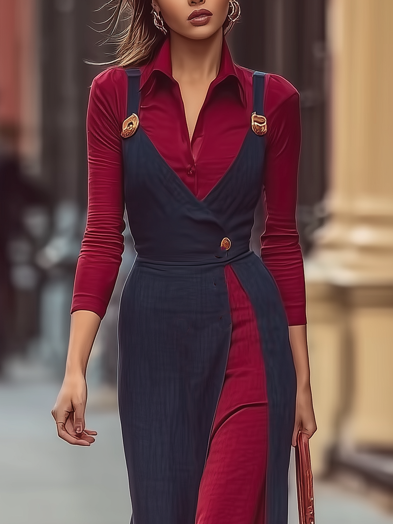 This dress showcases a chic two - tone design with burgundy and navy. It has a shirt - style top, suspender - like details, and a flowing silhouette. Perfect for adding a sophisticated touch to your look, suitable for various occasions.