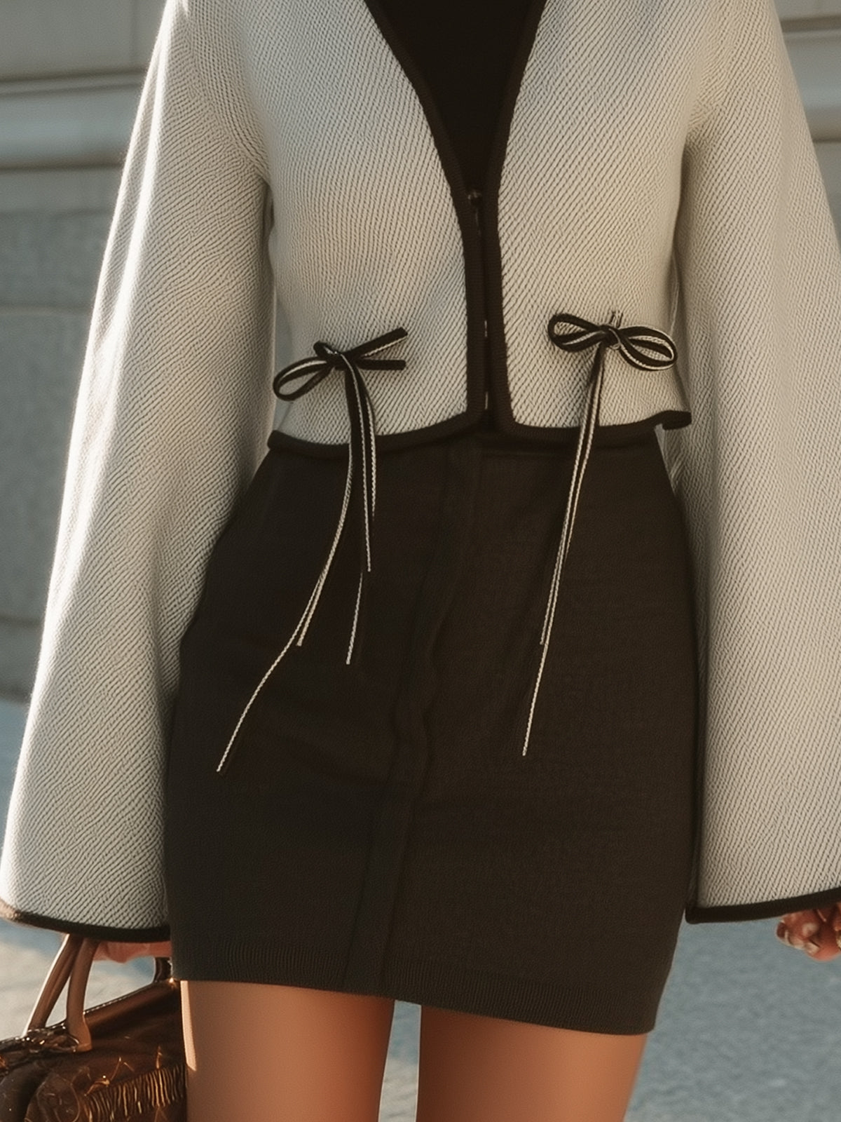 Contrast Color Bow Flared Sleeve Jacket Black Skirt Set