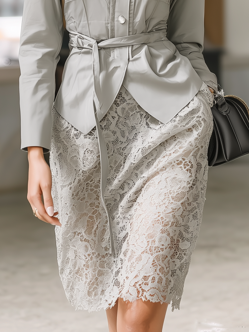 This set combines a grey blouse and a lace midi skirt. The blouse, made of smooth, lightweight fabric with a slight sheen, has a button - down design and a belt for a tailored fit. The skirt features delicate lace, adding elegance and intricacy.
