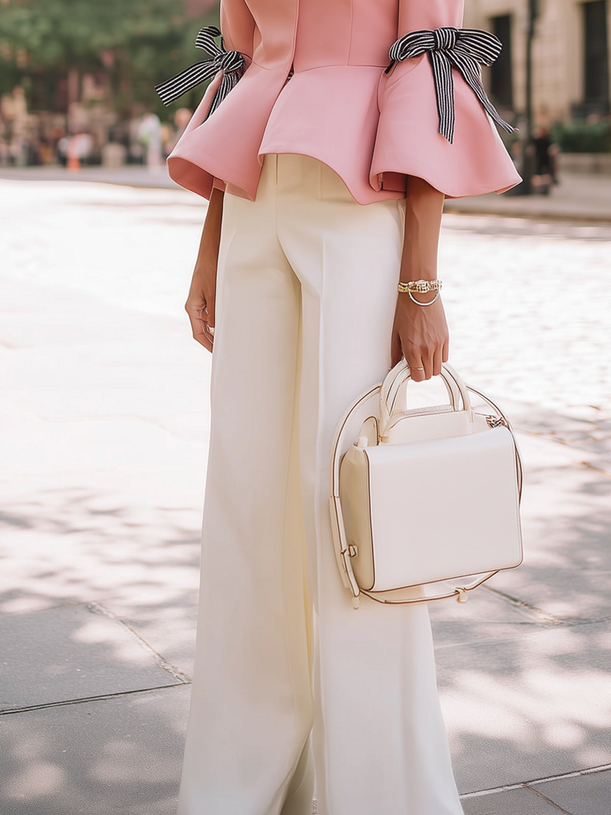 For gatherings with friends or small parties, pairing a pink top with white wide-leg pants creates a fresh and eye-catching look, perfectly fitting into a relaxed and cheerful atmosphere and showcasing your personal fashion sense.