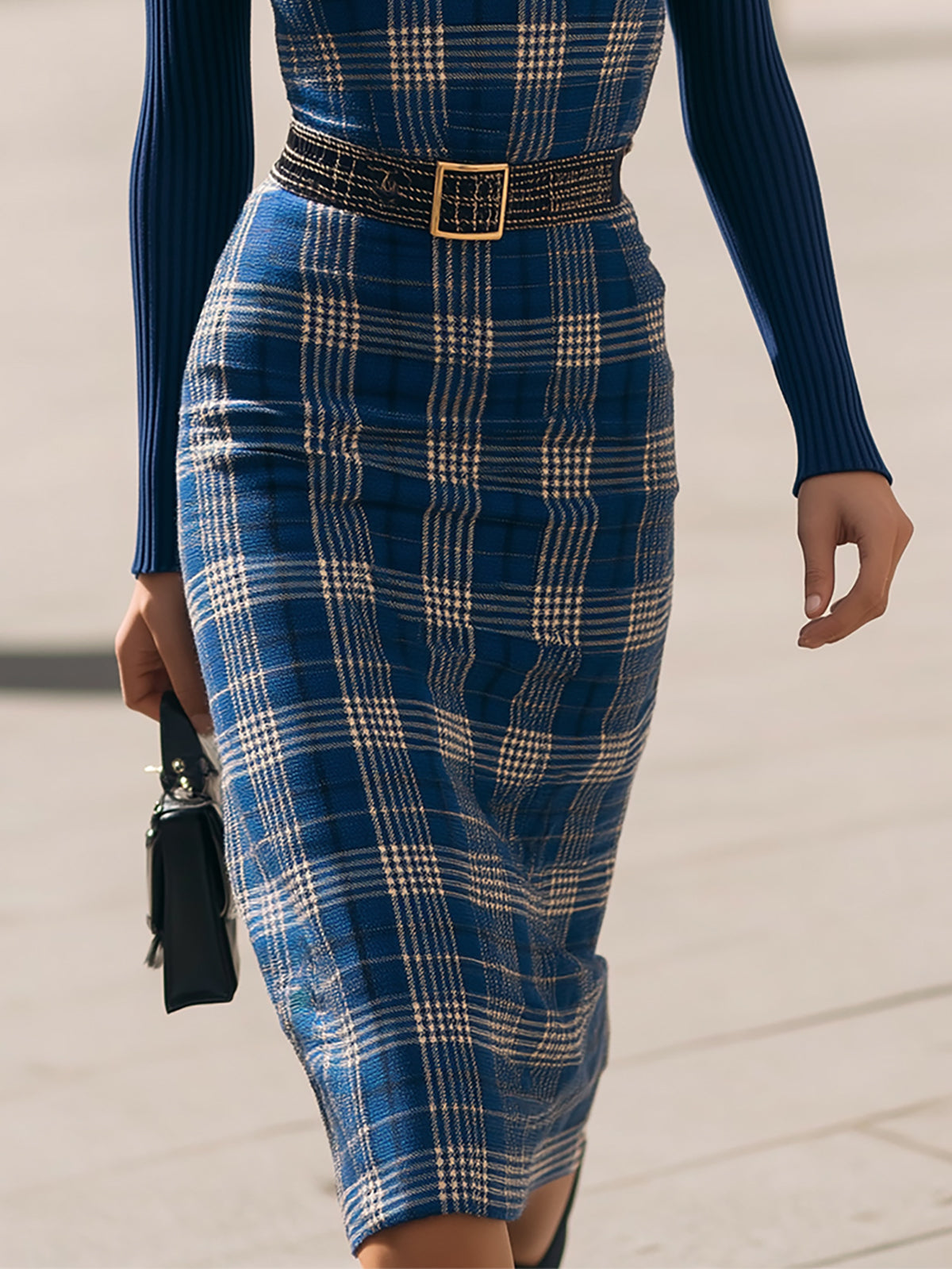 - Design: Features a stylish strapless plaid dress paired with a contrasting blue top, creating a modern layered look with a refined edge