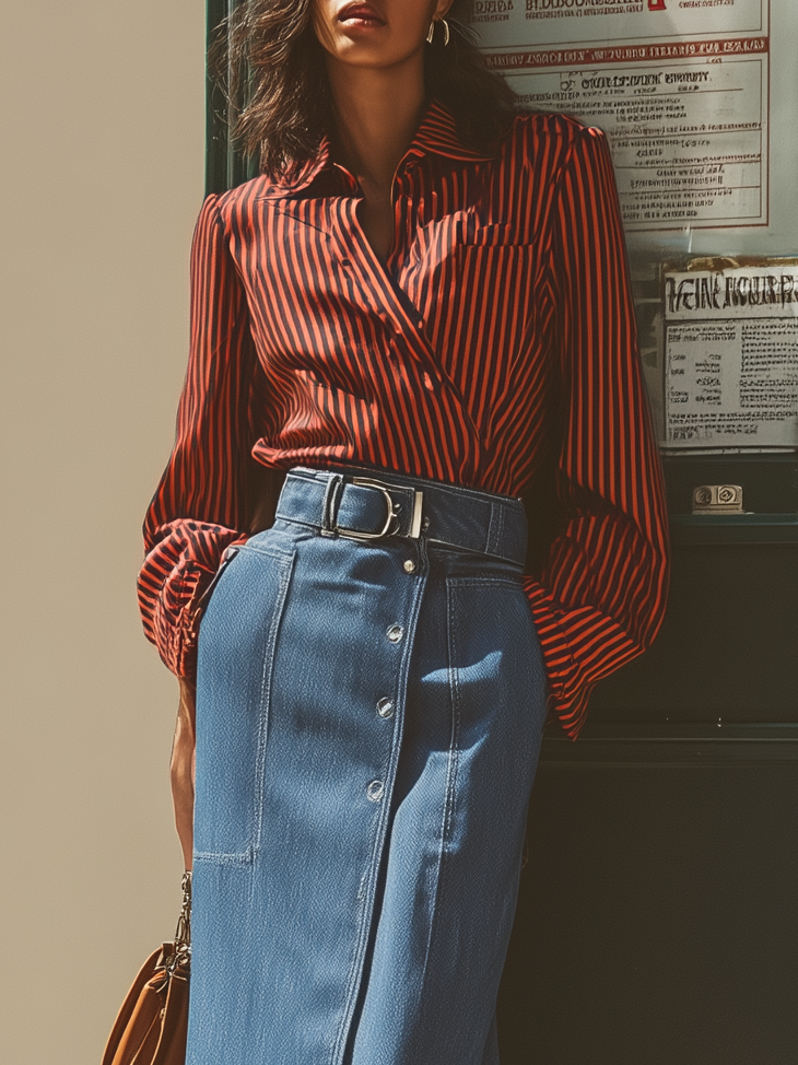 This set includes a striped wrap blouse and denim culottes. The blouse is crafted from smooth, lightweight fabric with a slight sheen. The culottes use durable yet soft denim, ensuring comfort while maintaining a structured, stylish appearance.