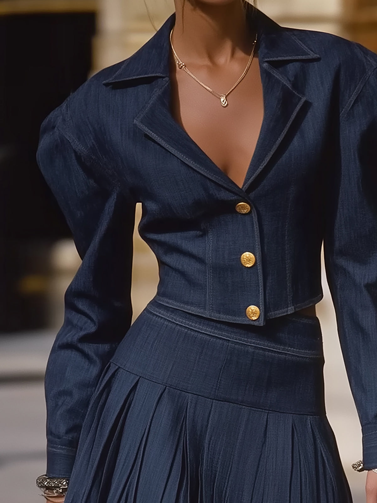 Stylish Blue Denim Puff - Sleeve Mini - Skirt Suit