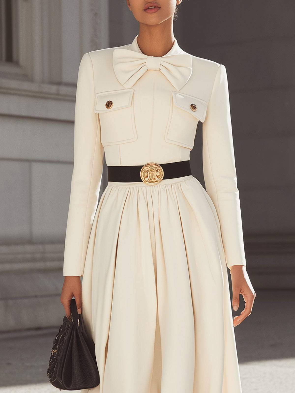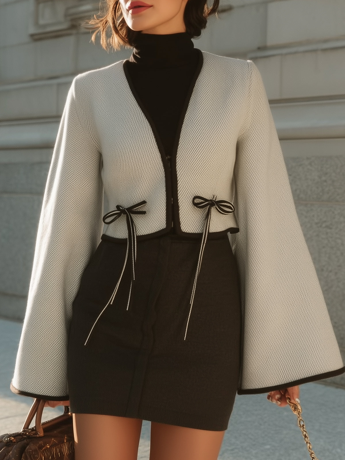 Contrast Color Bow Flared Sleeve Jacket Black Skirt Set