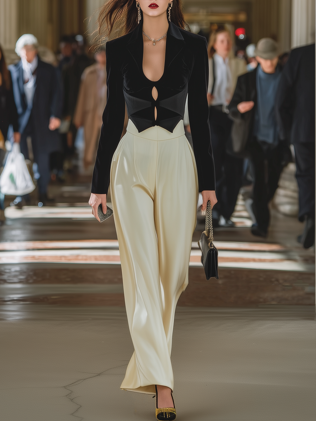 Black Velvet Blazer With Cream Wide - Leg Pants Set