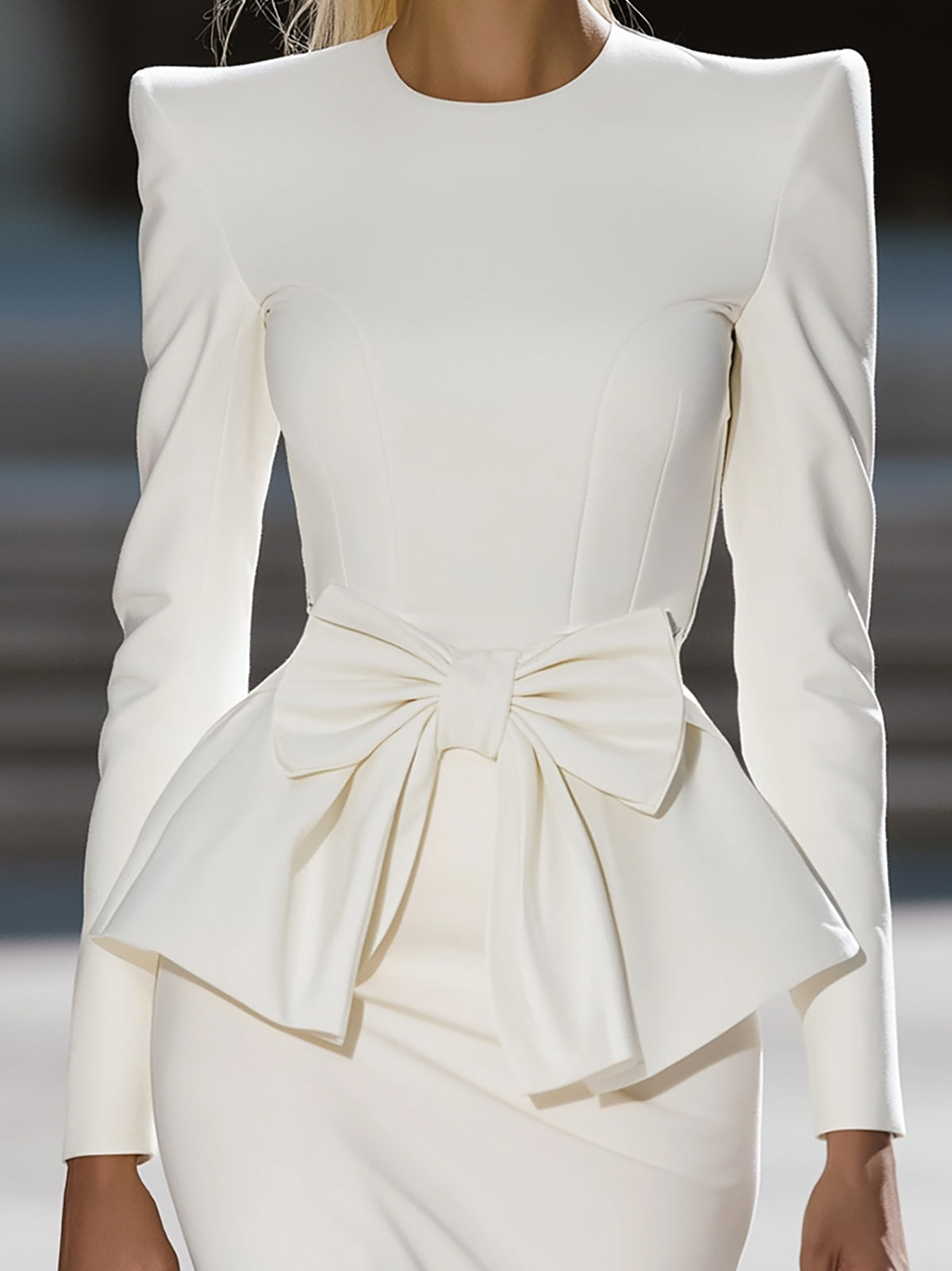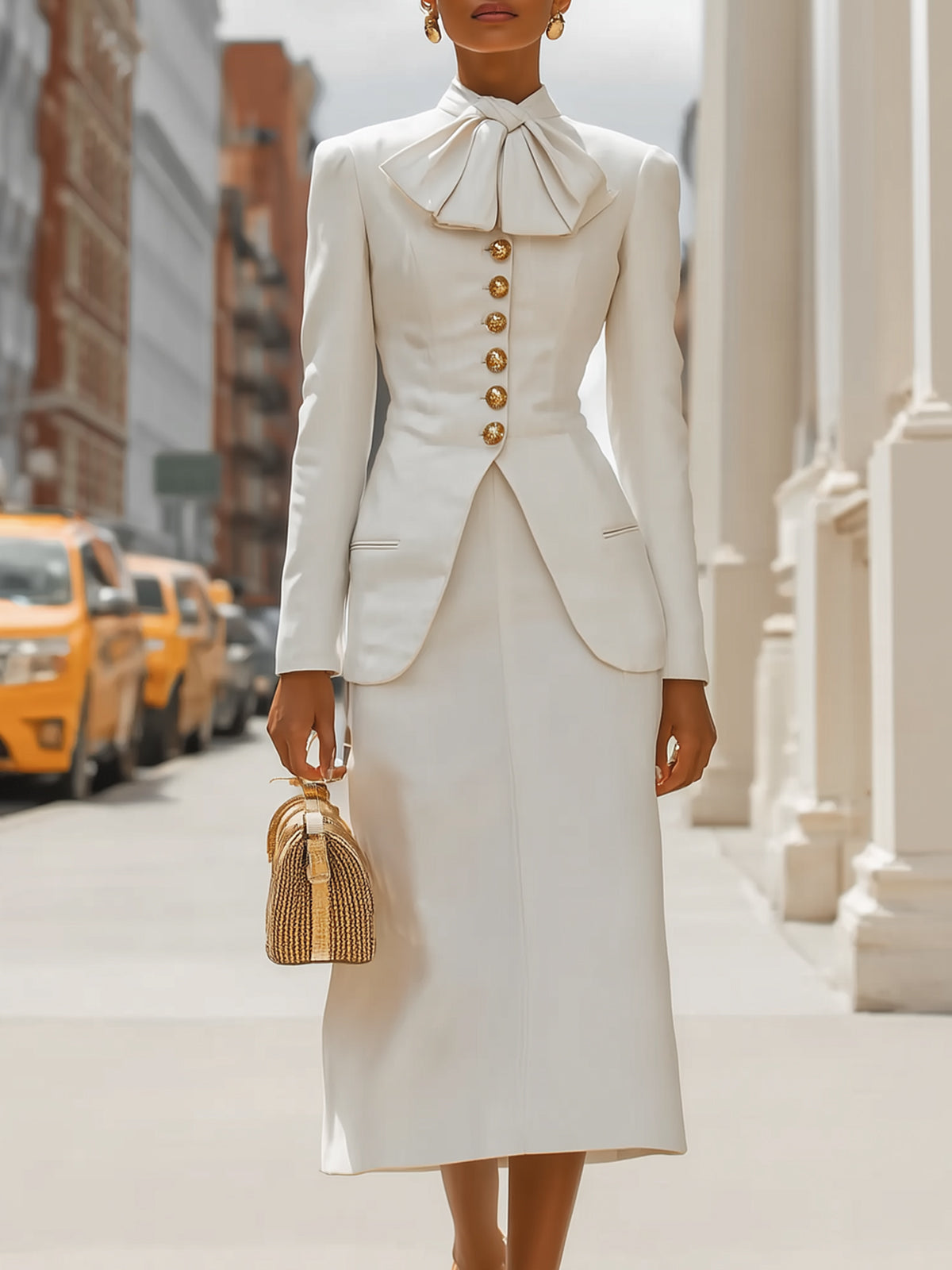 Off-white Bow-decorated Short Top With Slit Long Skirt Suit
