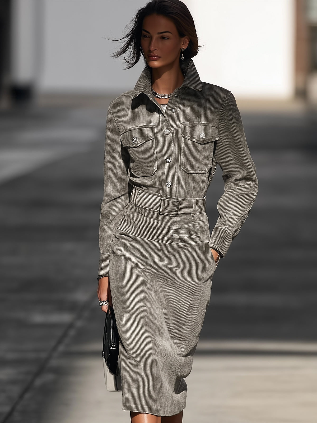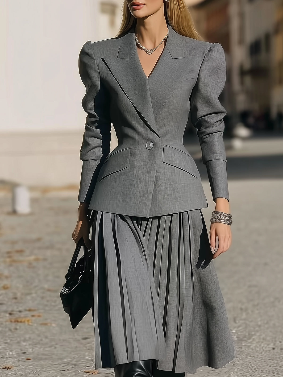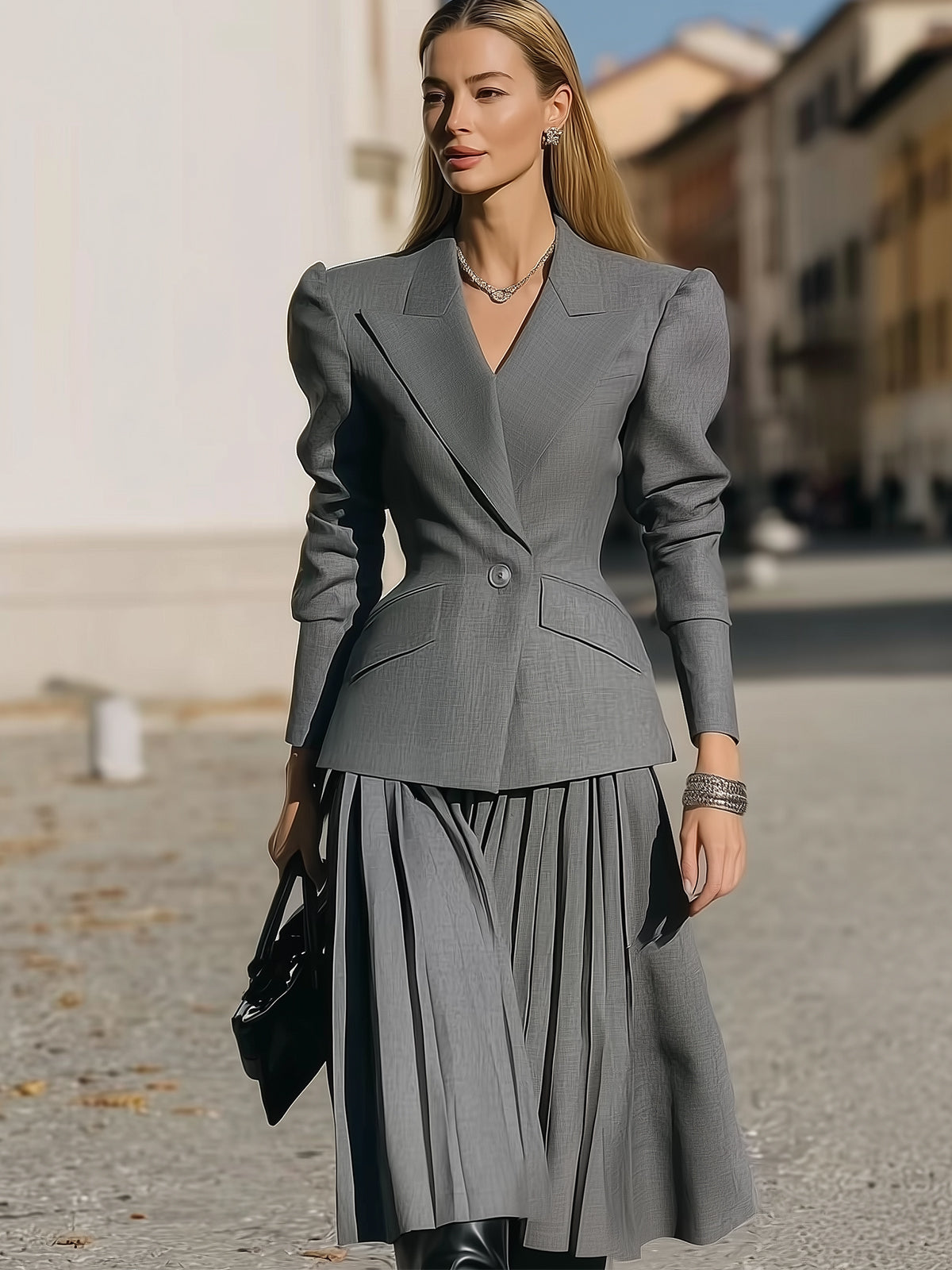 Elegant Grey Puff - Sleeve Pleated Skirt Outfit