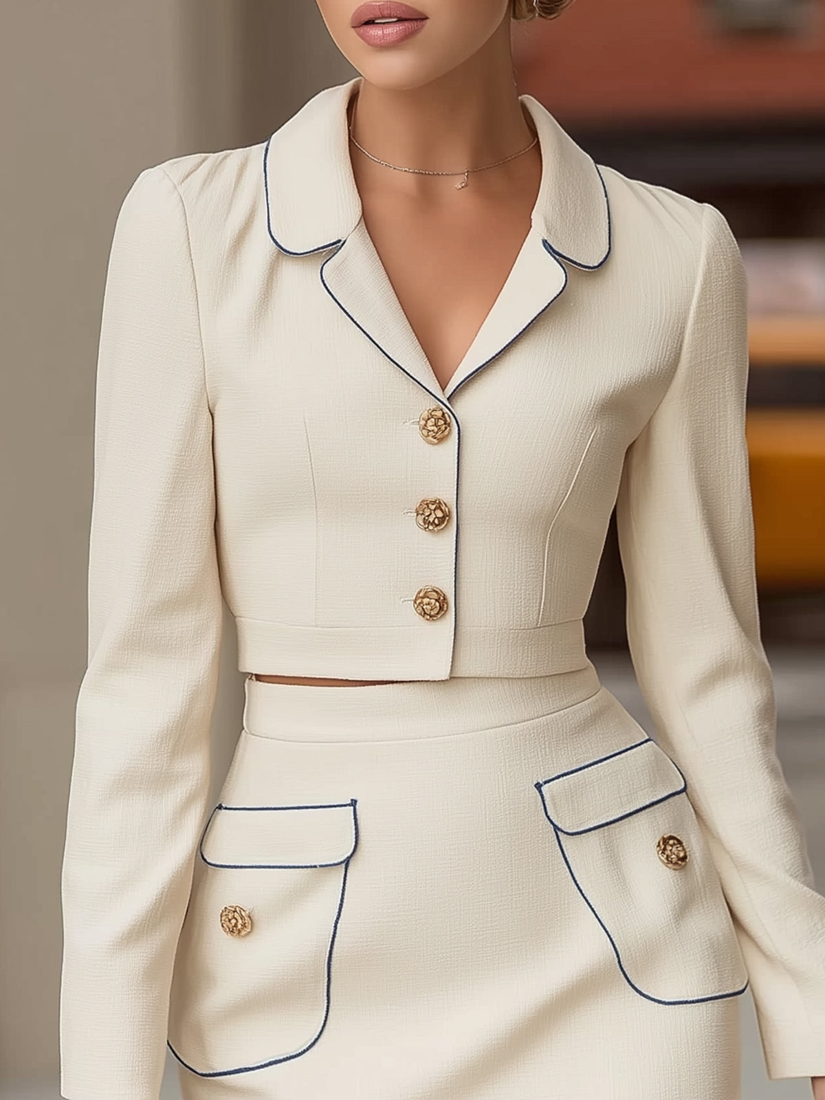 Navy Blue And White Trim Tweed Short Jacket With White Skirt Suit