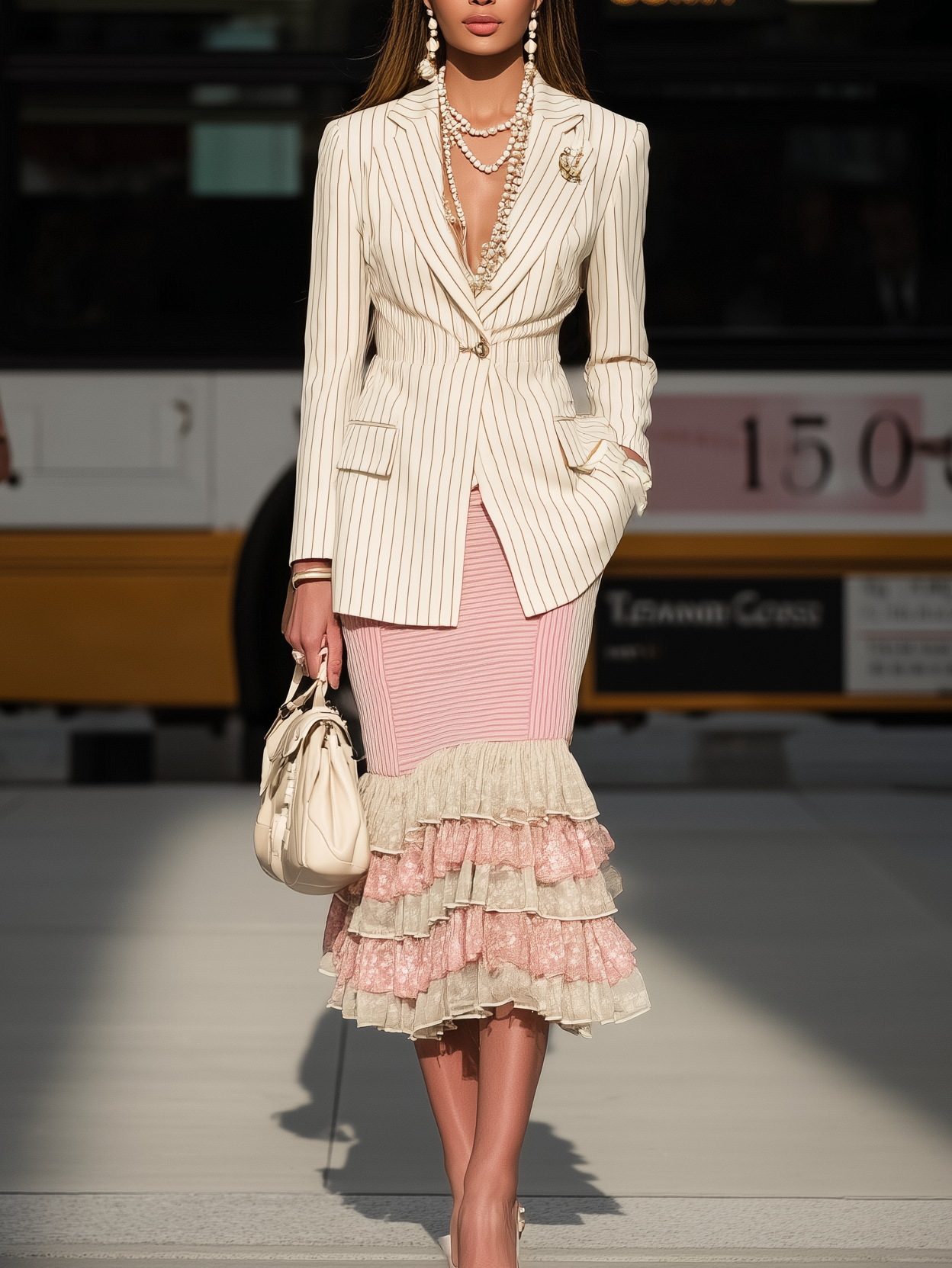 Cream Striped Blazer With Ruffled Pink Skirt Set