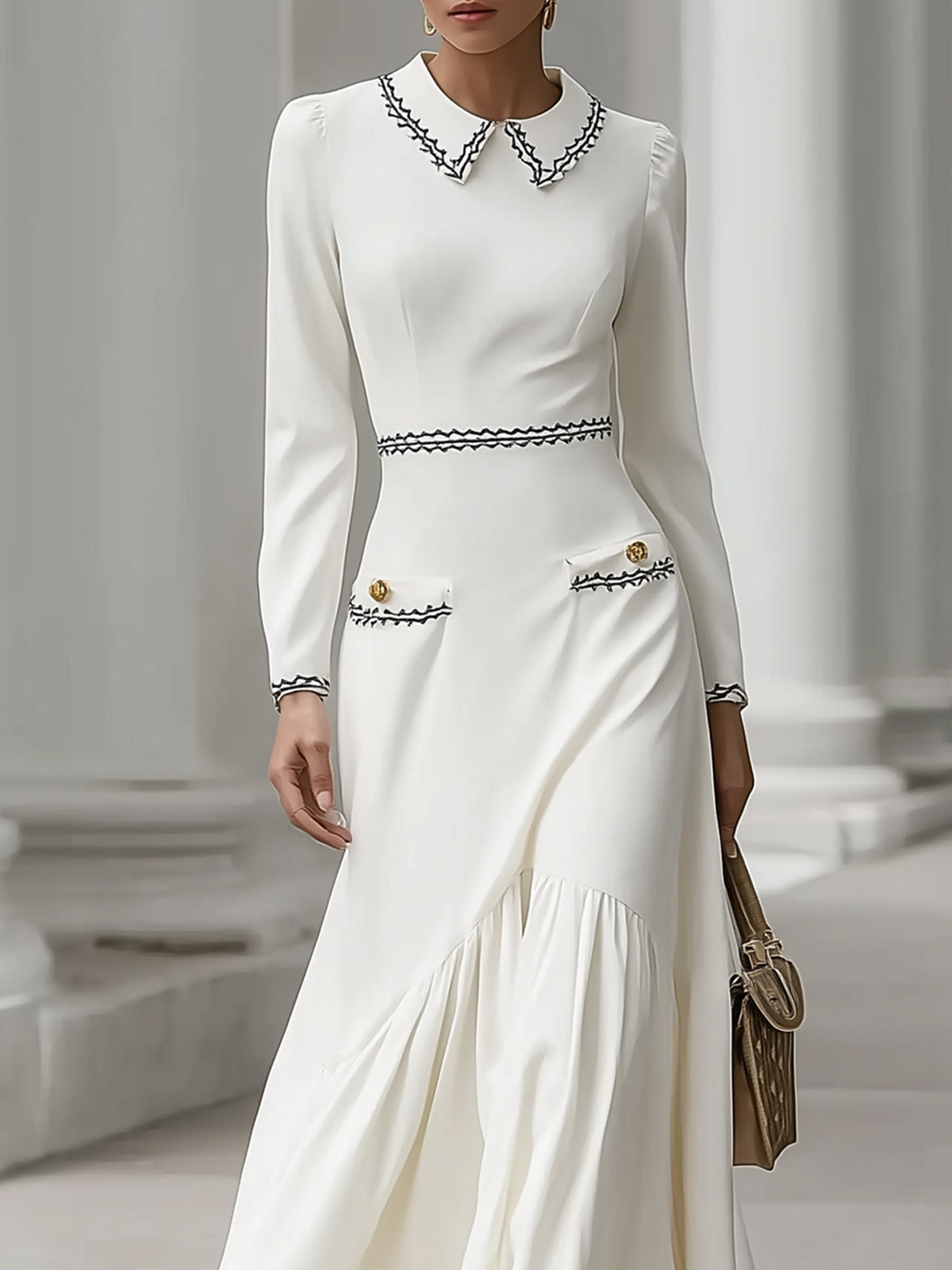 White Embroidered Peter Pan Collar Long-sleeved Maxi Dress