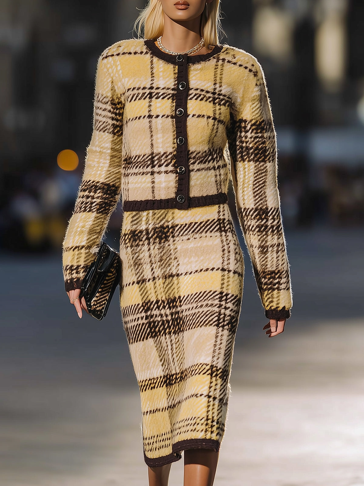 Elegant Light Yellow Cardigan Midi Skirt Set