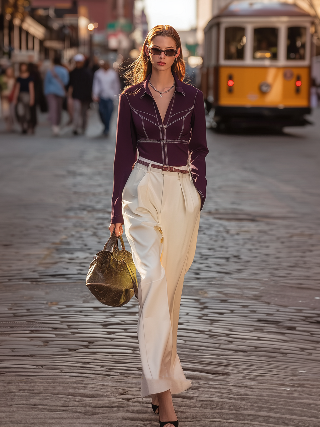 Purple Stitched Blouse With Cream Wide - Leg Trousers Set