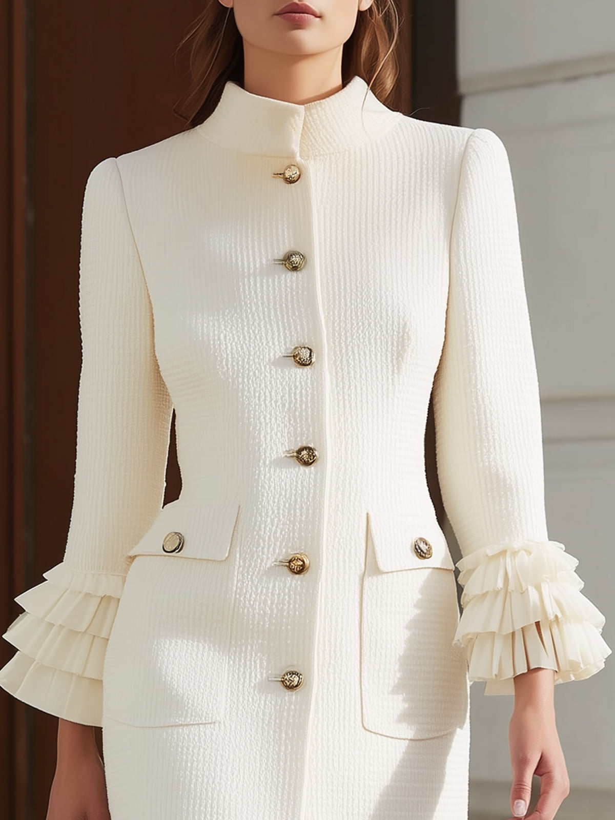 Off-white Tweed Ruffled Stand Collar Elegant Dress