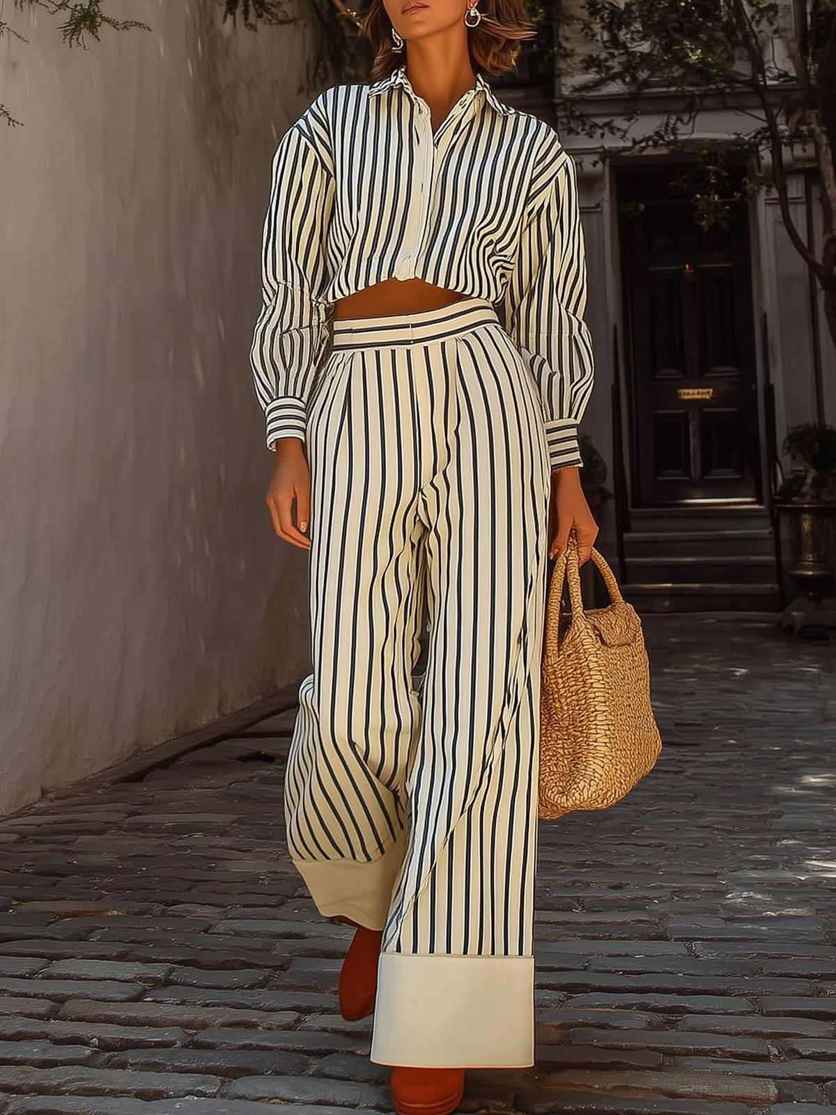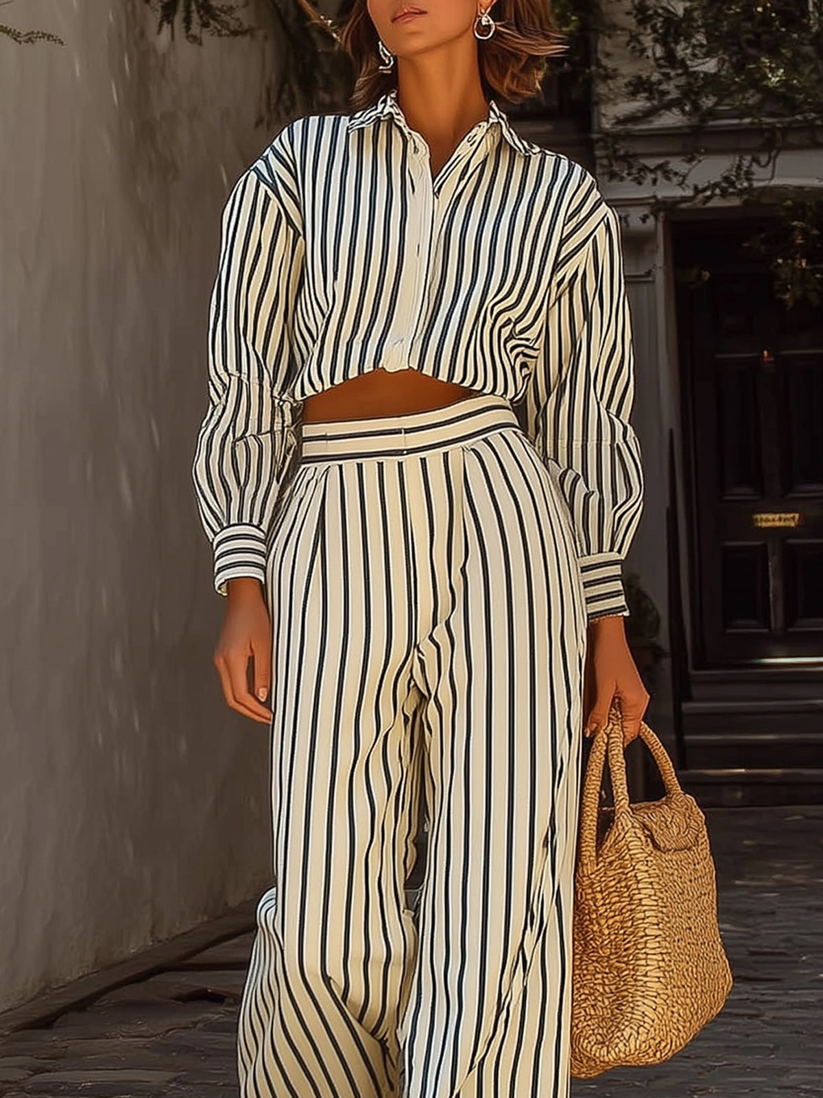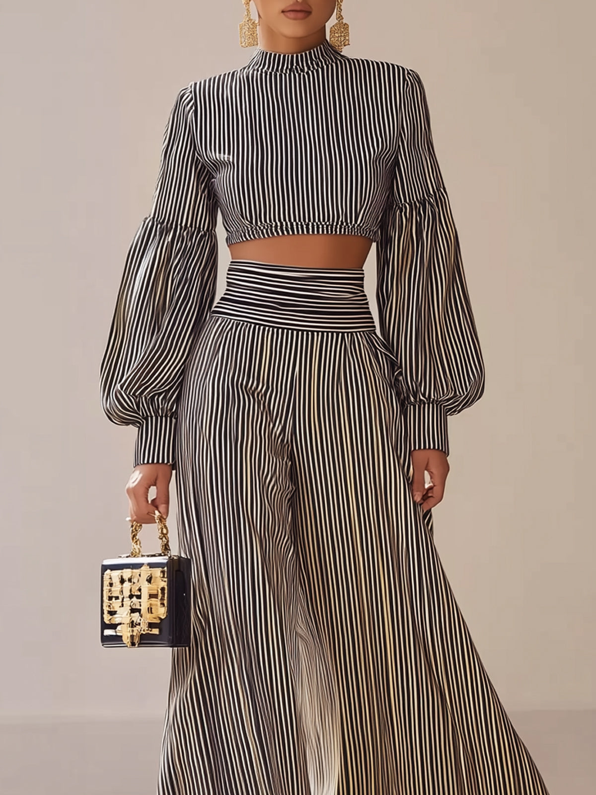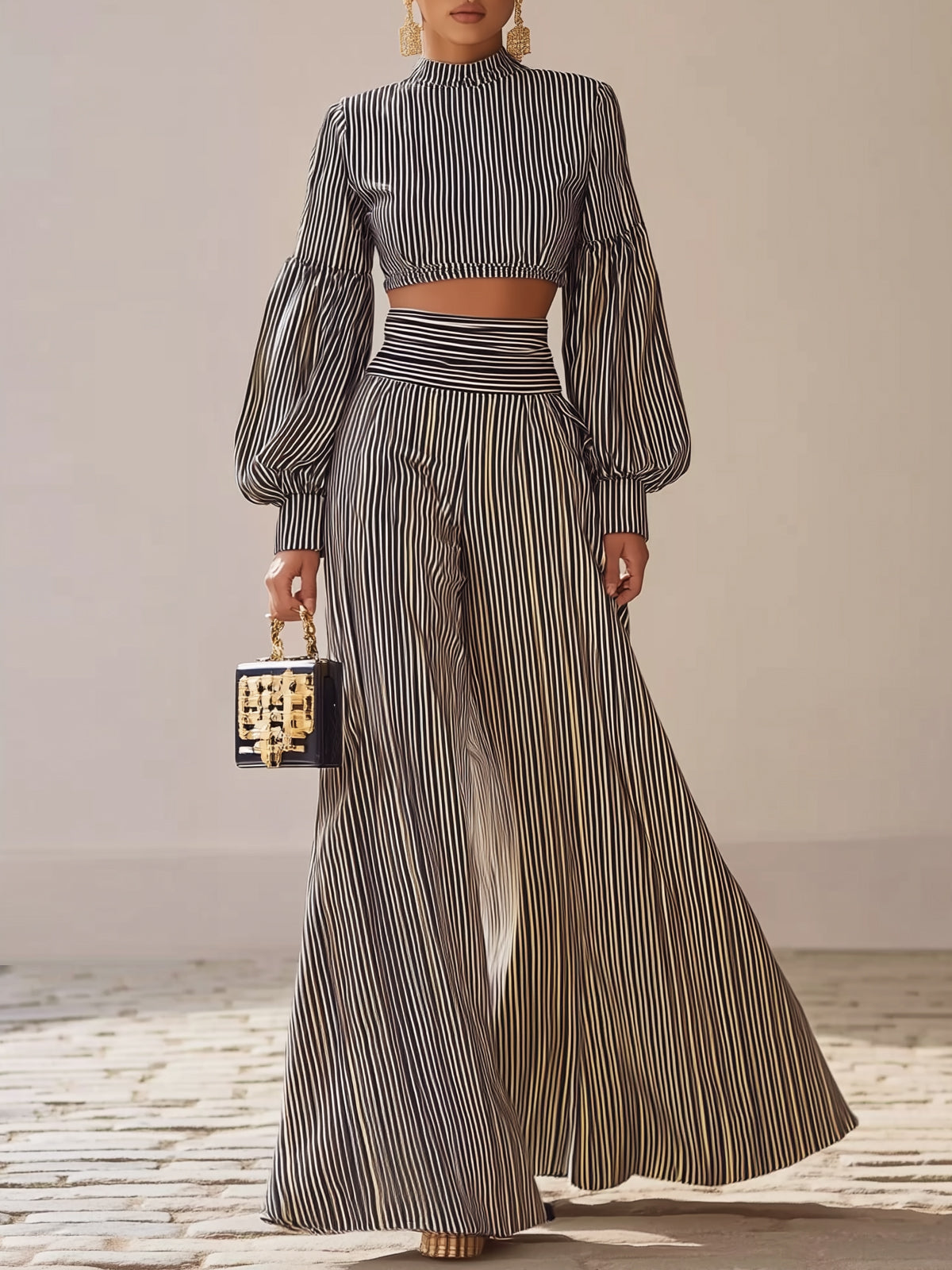 Striped Puff Sleeve Wide-leg Pants Set