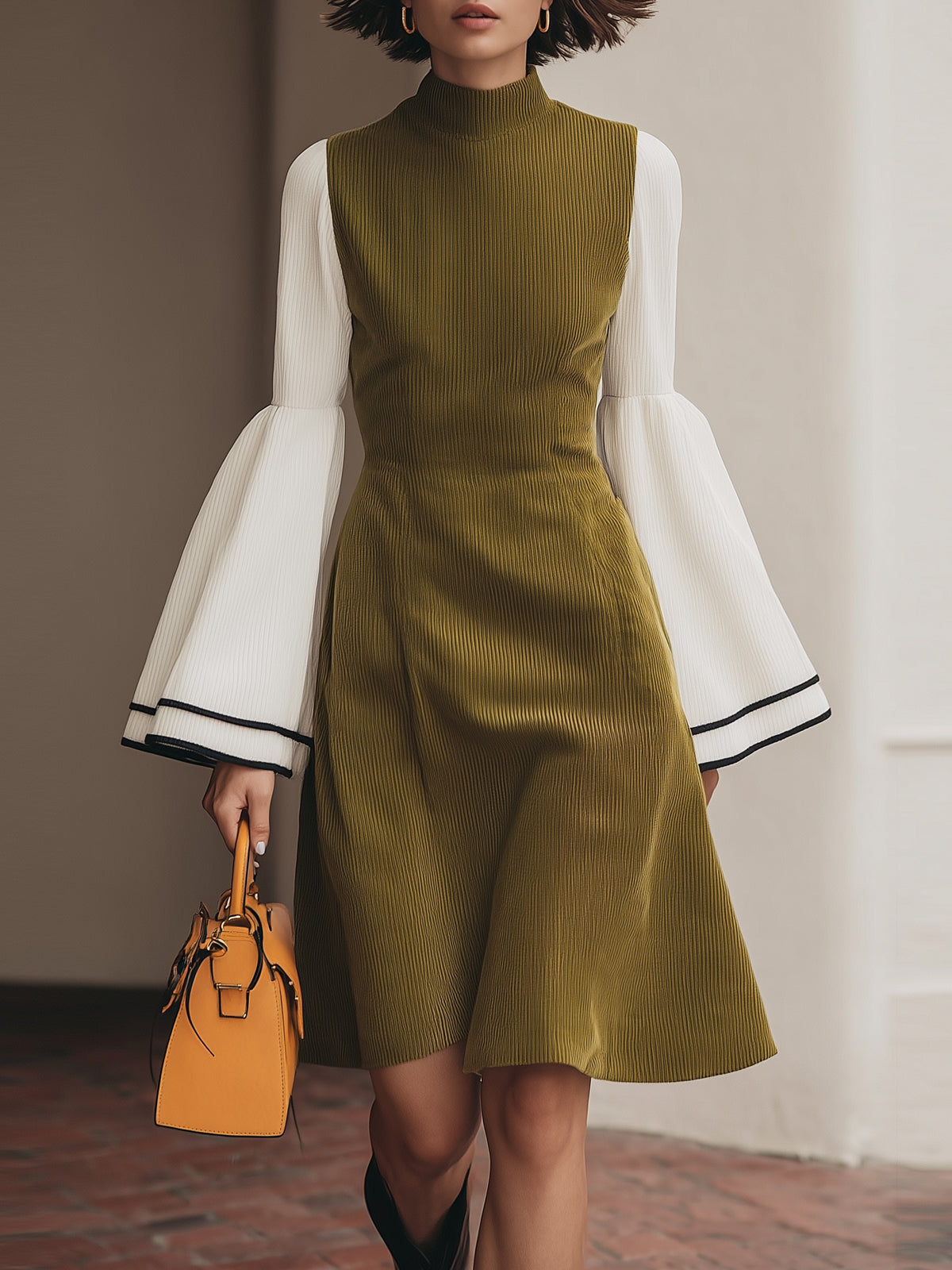 Retro Contrast Color Stitching Olive Green Dress