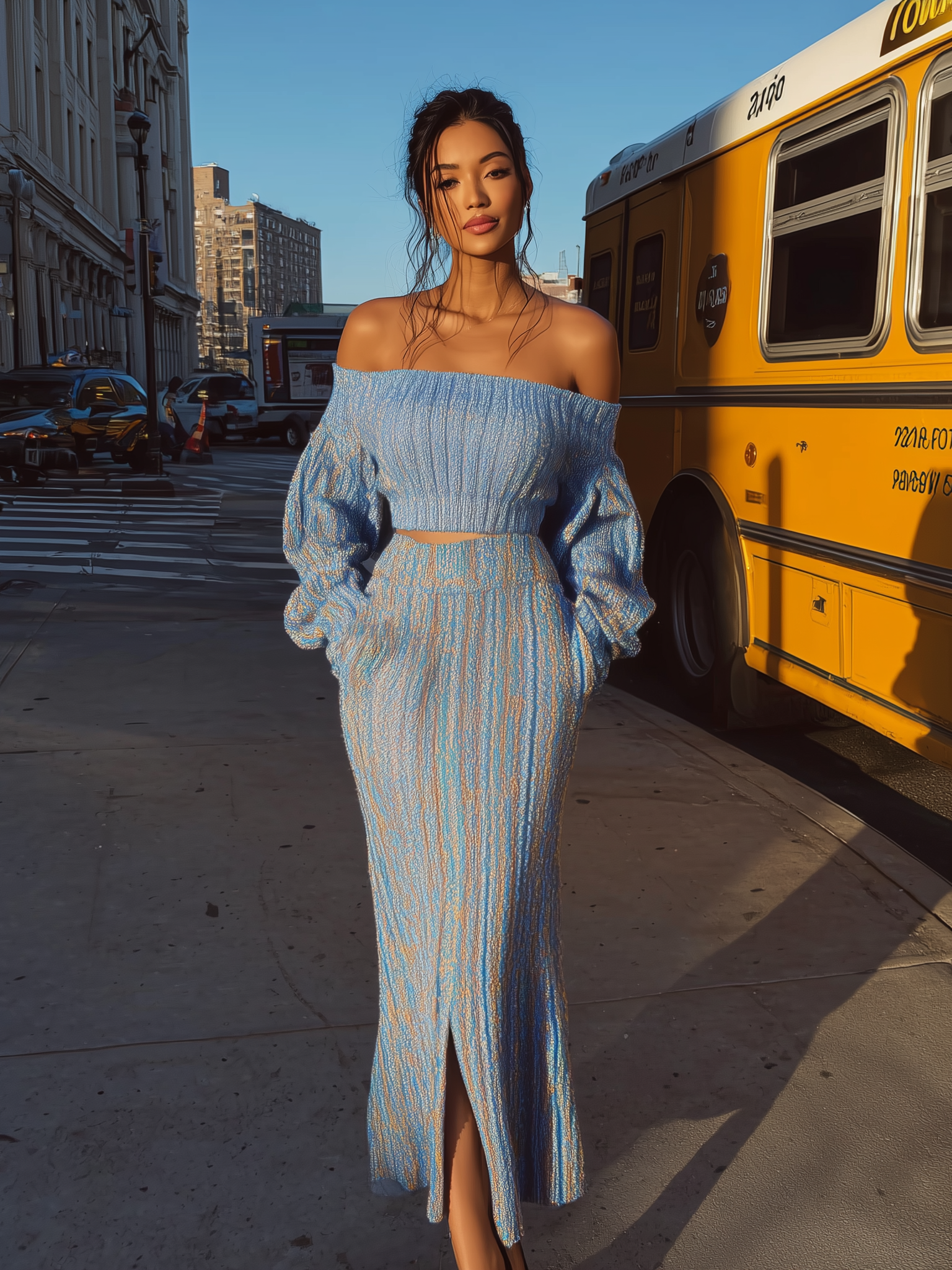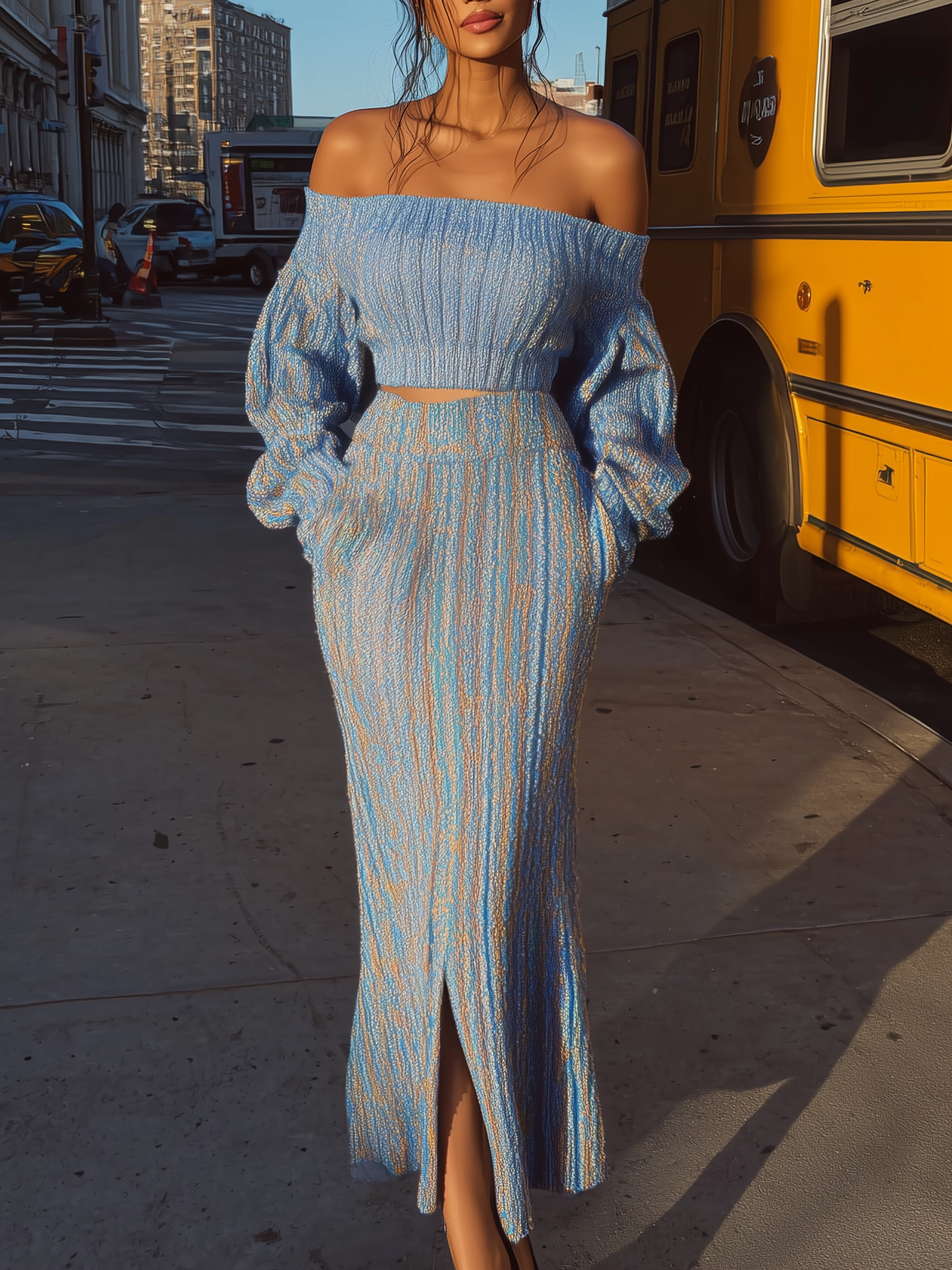 Blue Off - Shoulder Knit Top And Midi Skirt Set