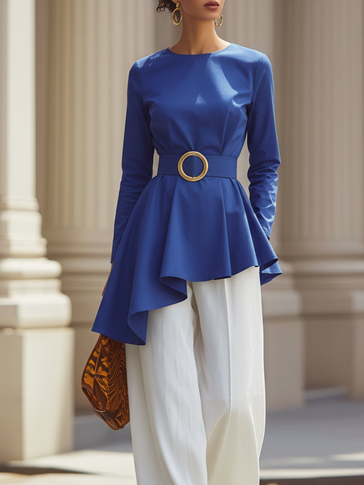 The slimming effect also creates a visual focal point, enhancing the overall sense of refinement and fashion. The irregular ruffled hem adds a touch of agility and elegance, breaking the monotony of the conventional style. The loose fit of the white wide-leg pants ensures comfort while also shaping the legs. The contrast with the color of the top creates a harmonious and layered overall combination, showcasing an elegant yet individual style.