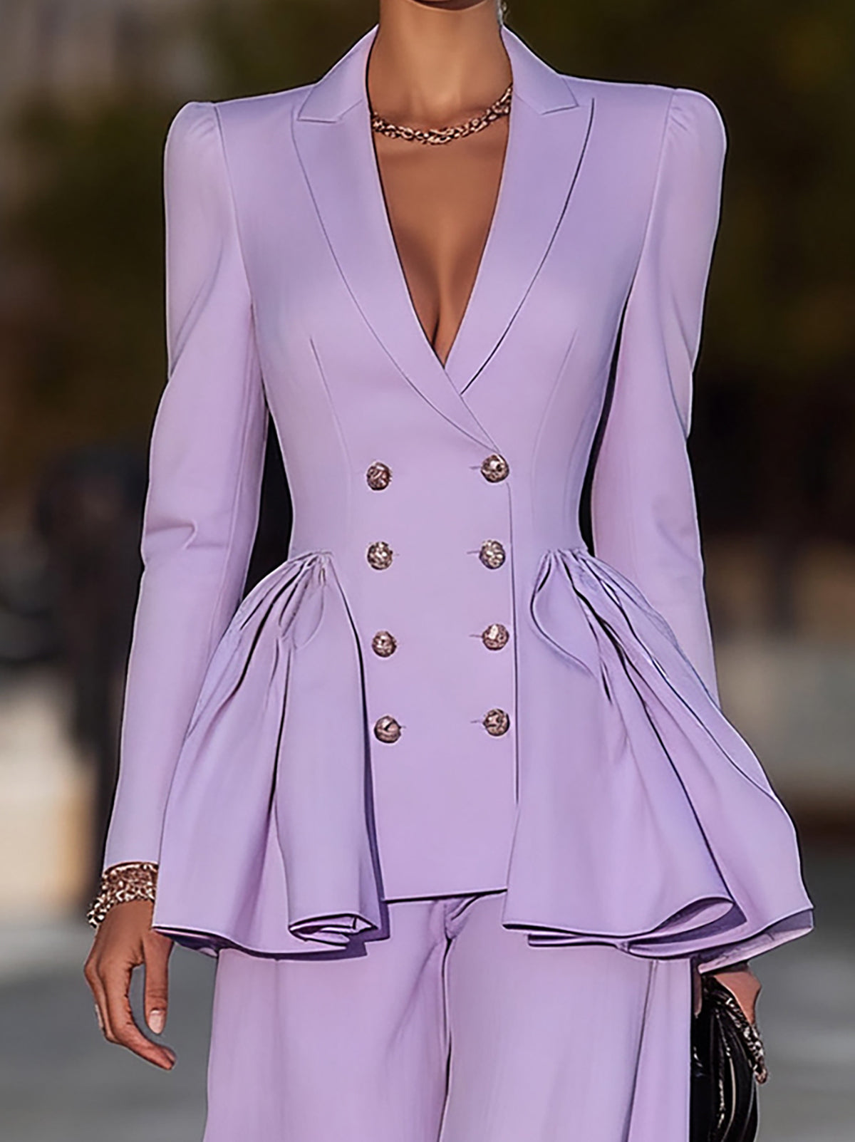 • Design: Features a tailored peplum blazer with a structured waist to accentuate curves, paired with matching wide-leg pants for a sophisticated, modern silhouette