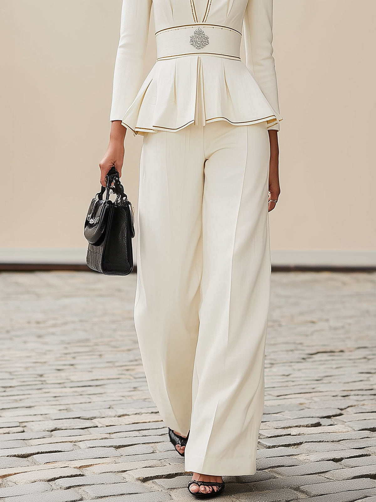 Bottom: The wide-leg pants, with their loose, draped silhouette, flatter the legs and create a relaxed, effortless look, balancing the refined feel of the top.