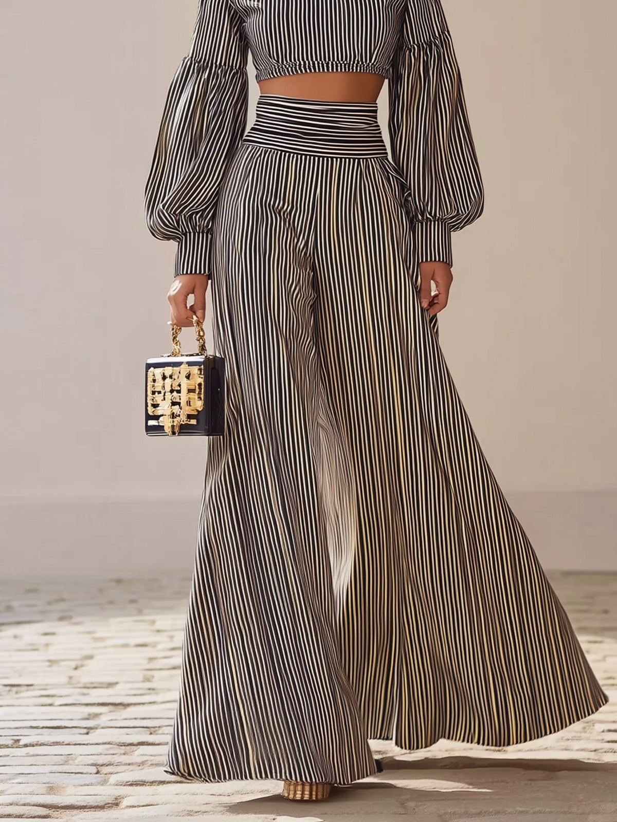 Design: Puff sleeves, wide-leg pants