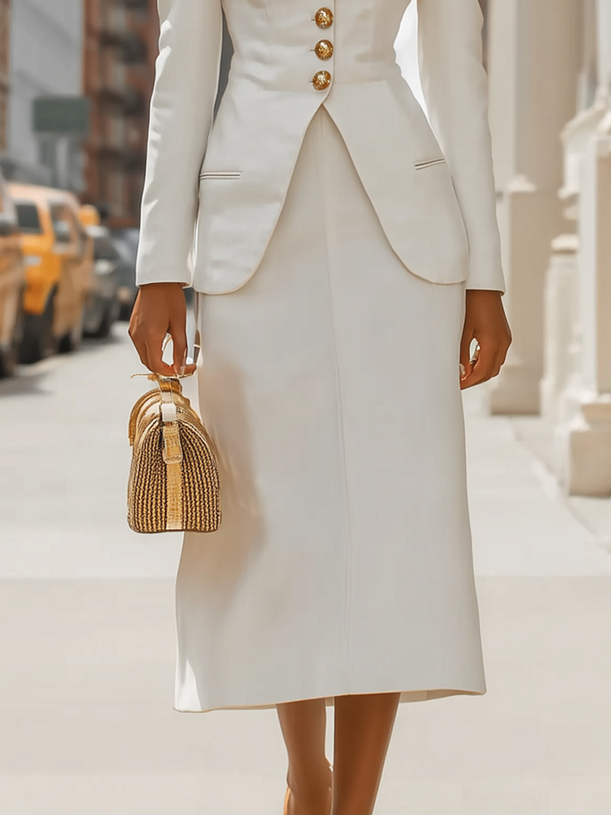 The bottom is a white, straight midi skirt that reaches mid-calf. The simple and elegant design complements the top's exquisite design, creating a harmonious and cohesive look.