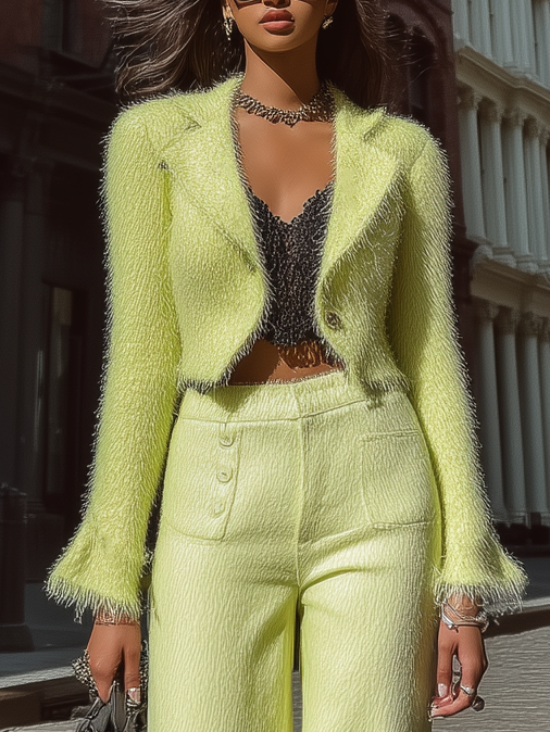 This yellow suit set features a cropped blazer with fuzzy detailing and wide - leg trousers. The blazer's tailored fit and the trousers' flowy silhouette create a chic contrast. Perfect for making a stylish statement at parties or casual outings, blending elegance and trendiness effortlessly.
