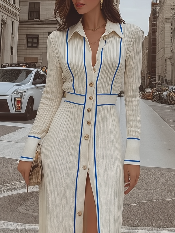 This cream maxi dress boasts blue trim for a pop of color. It has a button - front design, a cinched waist, and a thigh - high slit for allure. With a collared neckline and long sleeves, it's perfect for elevating your style at various occasions, blending elegance and trendiness.