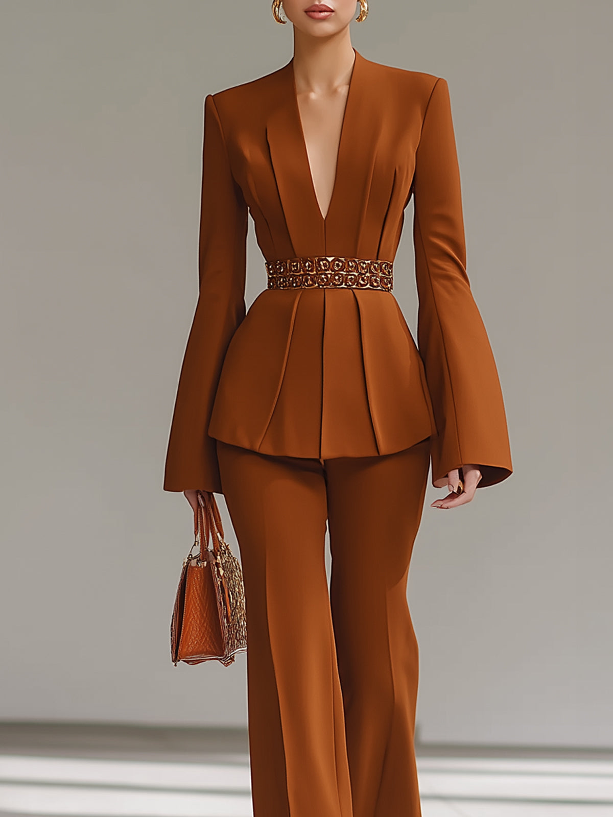 It's suitable for formal occasions like important meetings and business negotiations at work, as well as social occasions like casual parties and upscale dinners. It possesses the sophisticated and professional feel of a suit, showcasing the confident demeanor of a professional woman. The plunging V-neck, flared sleeves, and metal belt add a touch of fashion and luxury, making it a standout piece at parties and other events.