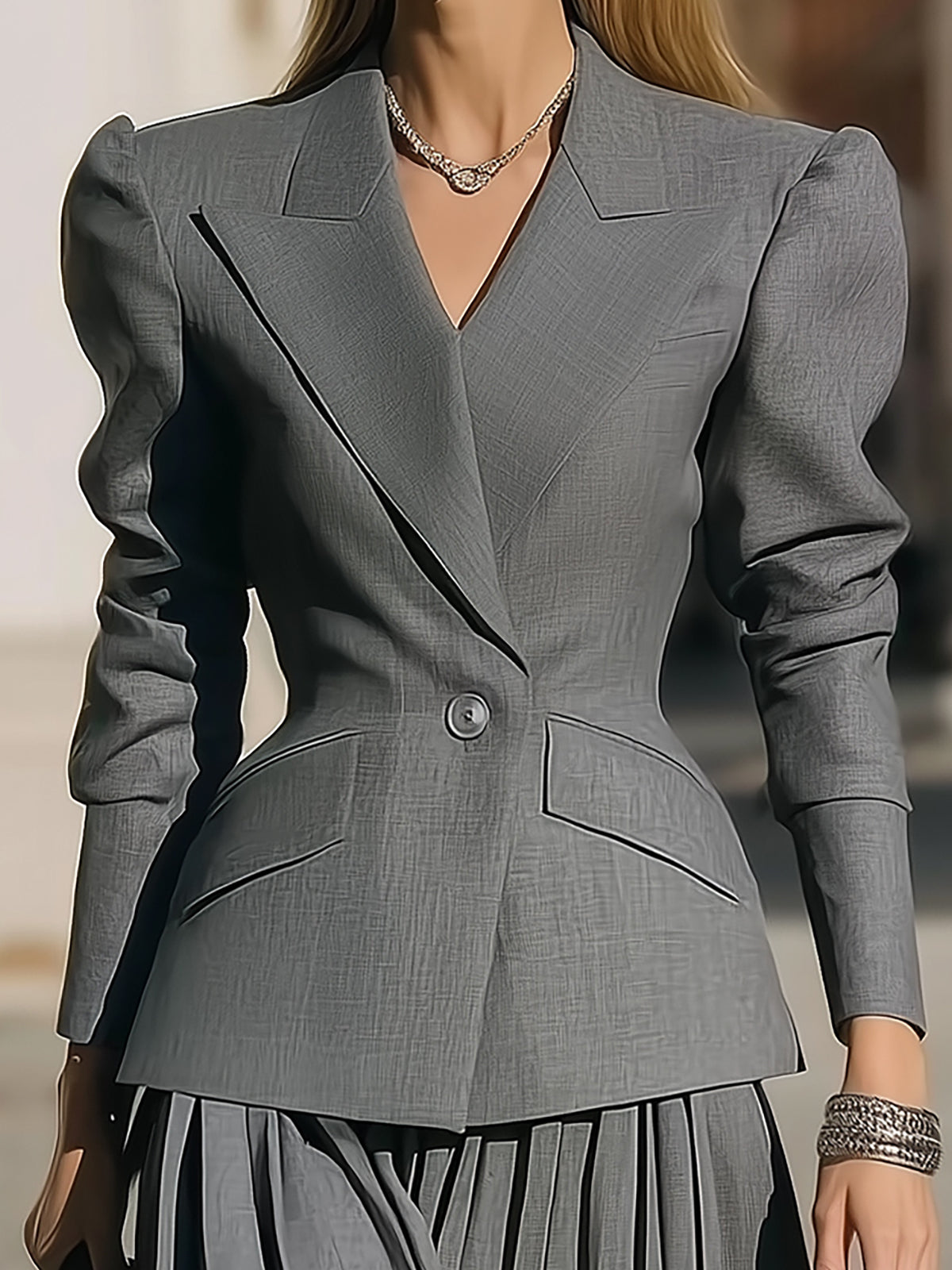 Make a statement with the Elegant Grey Puff-Sleeve Pleated Skirt Outfit—a timeless design that blends sophistication with modern femininity.