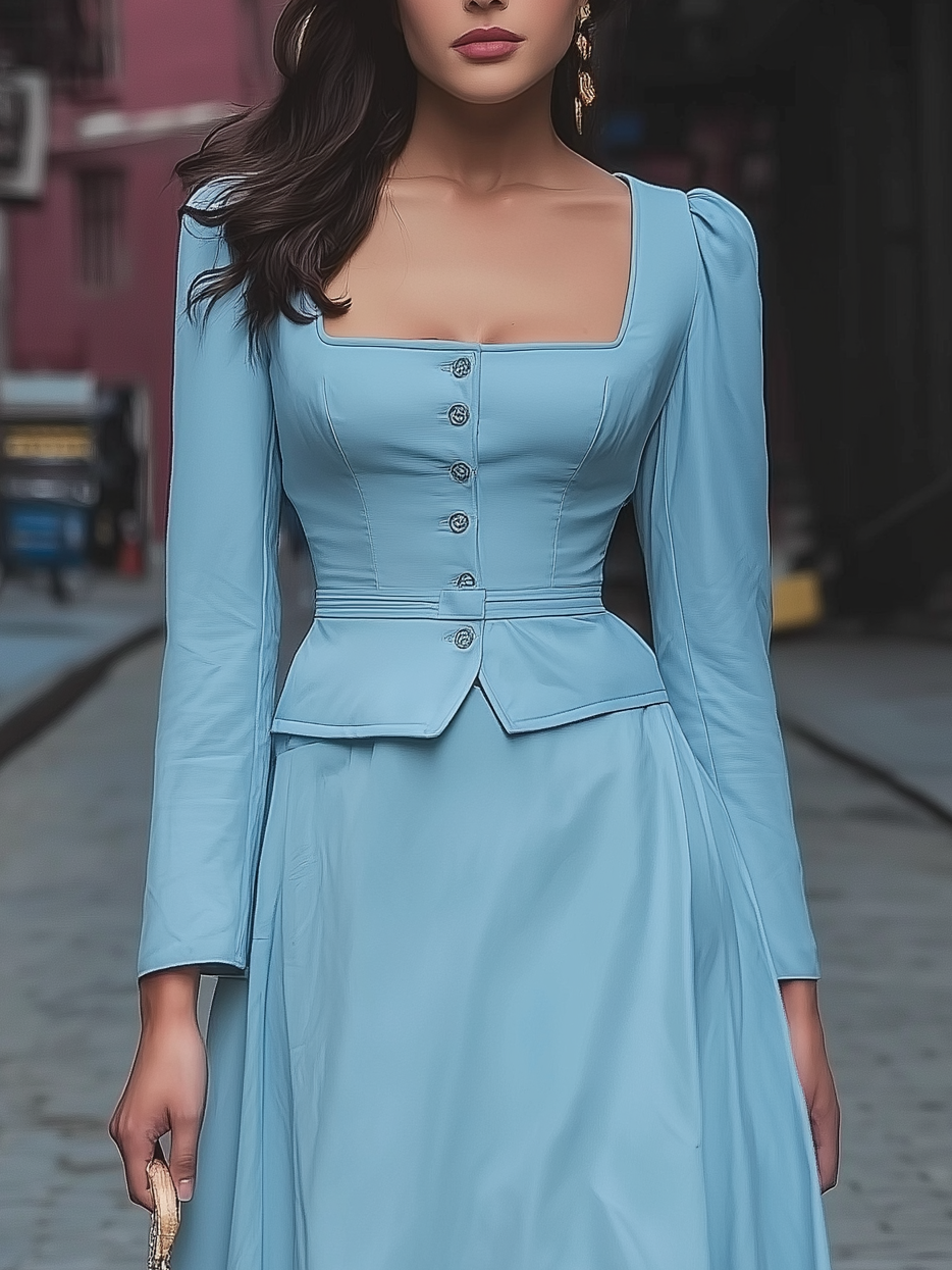 This light blue dress features a chic square neckline that highlights the collarbone. It has a row of buttons down the front and puff sleeves for a vintage - inspired touch. The fitted waist and flared skirt create a flattering silhouette, perfect for adding elegance to both casual and semi - formal occasions.